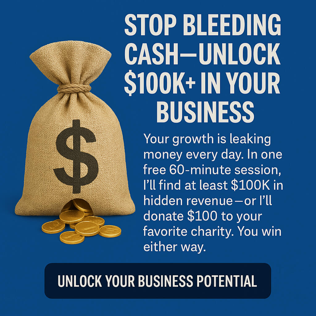 For service-based businesses scaling past $500K, your growth is leaking money every day. In one free 60-minute session, I’ll find at least $100K—or I’ll donate $100 to your favorite charity. You win either way.